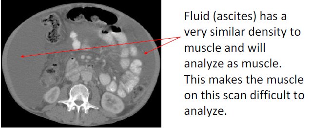 ·If this scan is to be analyzed using normal muscle HU limits (-29 to +150), the muscle boundary will be difficult to determine and the image difficult to analyze