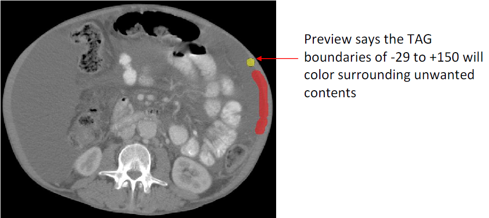 ·With this information, the muscle TAG boundary will need to be temporarily adjusted so that it only analyzes tissue that is muscle and not unwanted surrounding contents