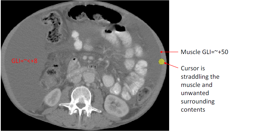 oPlace the cursor over the muscle and determine its GLI (or HU value). Move the cursor around the muscle and determine its rough GLI.