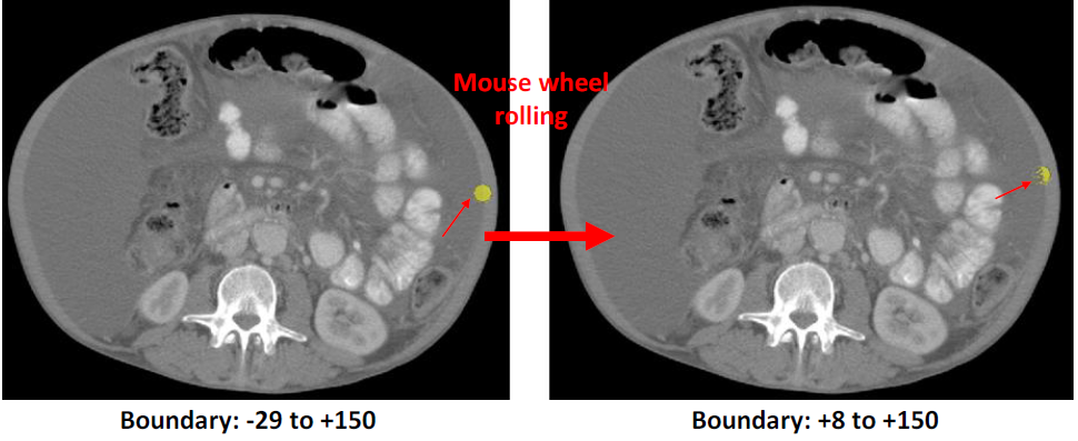 oAfter, place the cursor over the surrounding tissue which falls inside the - 29 to +150 range, but is not muscle to find out its rough GLI (or HU value).