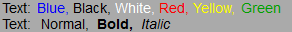 OpenGL_Text_DrawRasterFont( "Text: \01 Blue, \02 Black, \03 White \04 Red, \05 Yellow, \06 Green", 10, 0, 0, 0, 5, 25, 5 ) ;